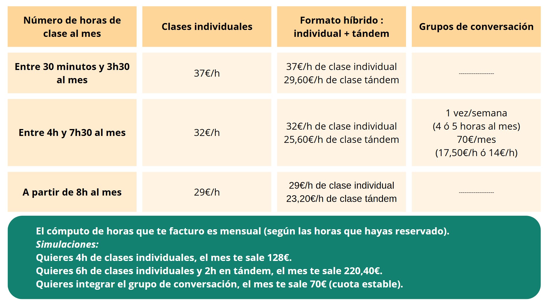Tienes clases individuales (pueden ser el 50% o 75% del total de tus clases mensuales) y prácticas de conversación en pareja con alguien de nivel similar.